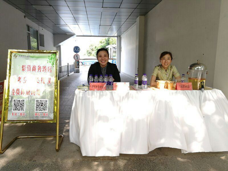 一年一度的高考正在進行中,紫藤商務酒店在揚州中學考點對面設置了“高考愛心服務站”,擺放了熱心助考宣傳欄,配備飲用水、銀耳羹、扇子等,貼心為考生和在外等候的家長們服務。