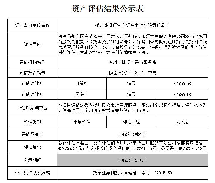 關(guān)于擬轉(zhuǎn)讓揚(yáng)州聯(lián)眾市場(chǎng)管理服務(wù)有限公司23.5474%國(guó)有股權(quán)的公告