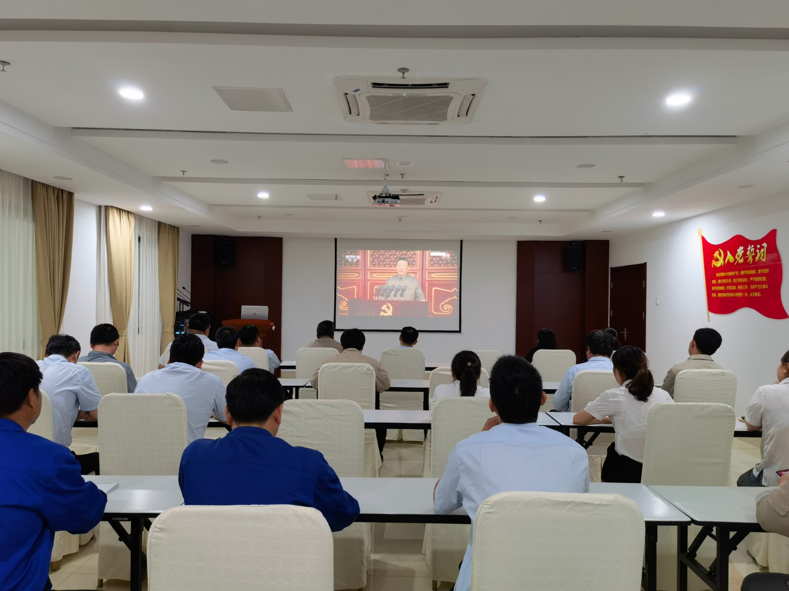 冶春食品公司黨支部全體黨員、預(yù)備黨員和入黨積極分子,總經(jīng)理室成員,團(tuán)支部委員和工會委員集中觀看慶祝大會。