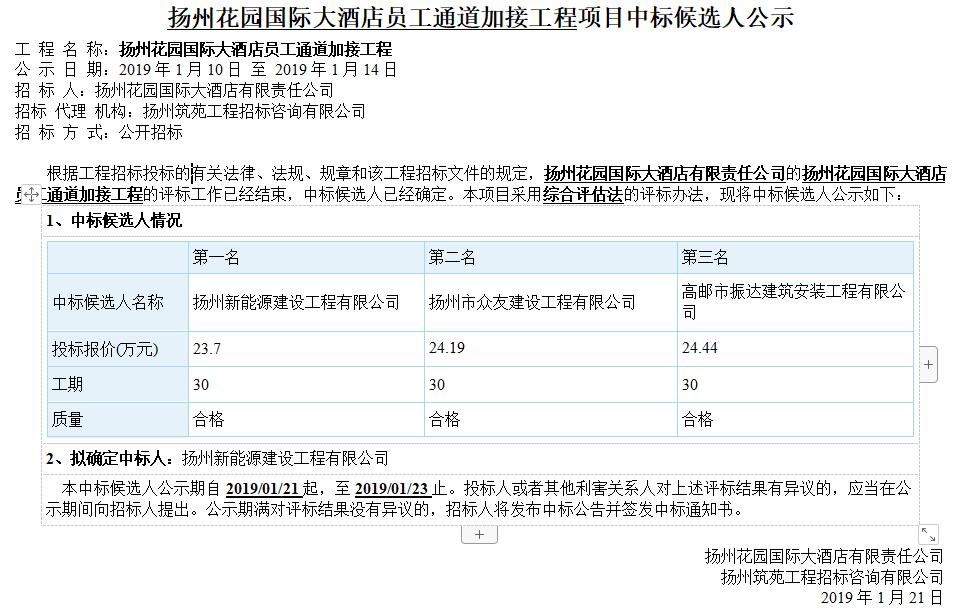 揚(yáng)州花園國際大酒店員工通道加接工程項目中標(biāo)候選人公示