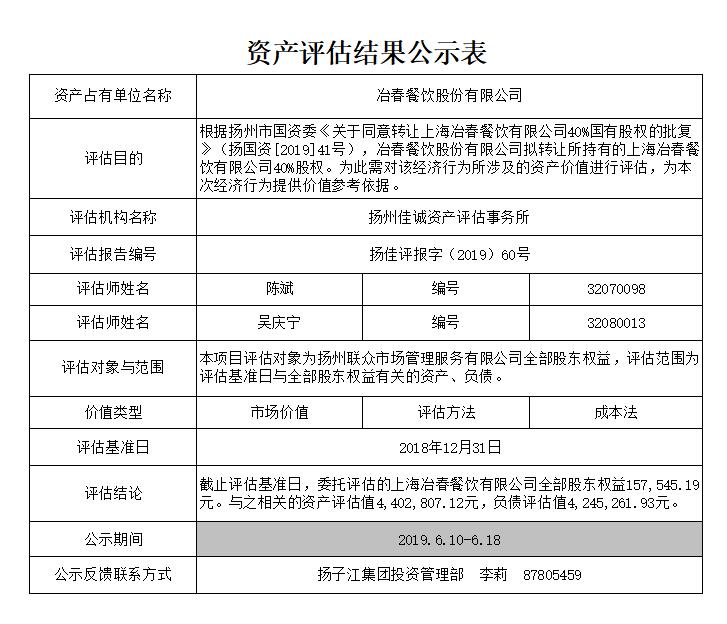 根據(jù)揚州市國資委《關(guān)于同意轉(zhuǎn)讓上海冶春餐飲有限公司40%國有股權(quán)的批復(fù)》(揚國資[2019]41號),冶春餐飲股份有限公司擬轉(zhuǎn)讓所持有的上海冶春餐飲有限公司40%股權(quán),現(xiàn)公告如下: 一、經(jīng)過甄選比價,冶春餐飲股份有限公司選聘揚州佳誠資產(chǎn)評估事務(wù)所承擔本次股權(quán)轉(zhuǎn)讓的評估工作,評估基準日為2018年12月31日(相關(guān)評估內(nèi)容見《資產(chǎn)評估結(jié)果公示表》)。 二、自公告之日起7個工作日內(nèi)接受咨詢,咨詢電話:87805459,聯(lián)系人:李莉。