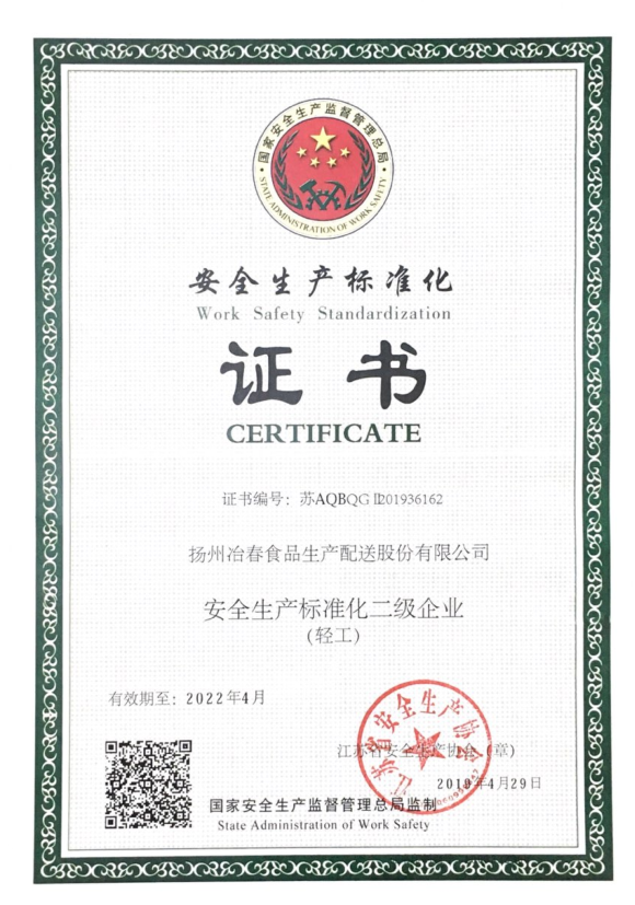 冶春食品被評國家級安全生產(chǎn)標準化二級企業(yè)